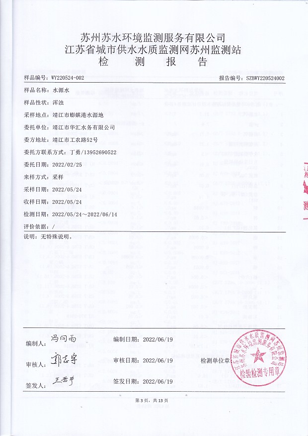 2021年下半年水源水水質(zhì)報告