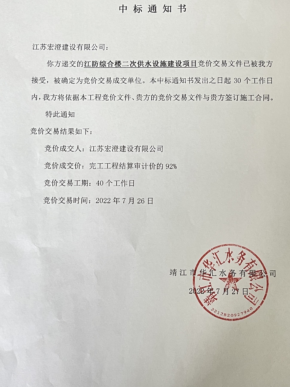 江防綜合樓二次供水設(shè)施建設(shè)項(xiàng)目中標(biāo)通知書