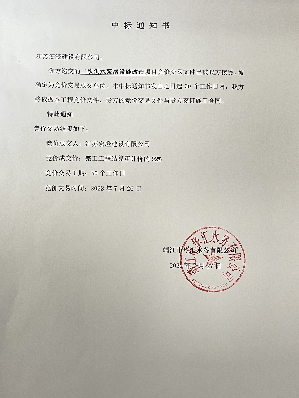 二次供水泵房設(shè)施改造項(xiàng)目中標(biāo)通知書