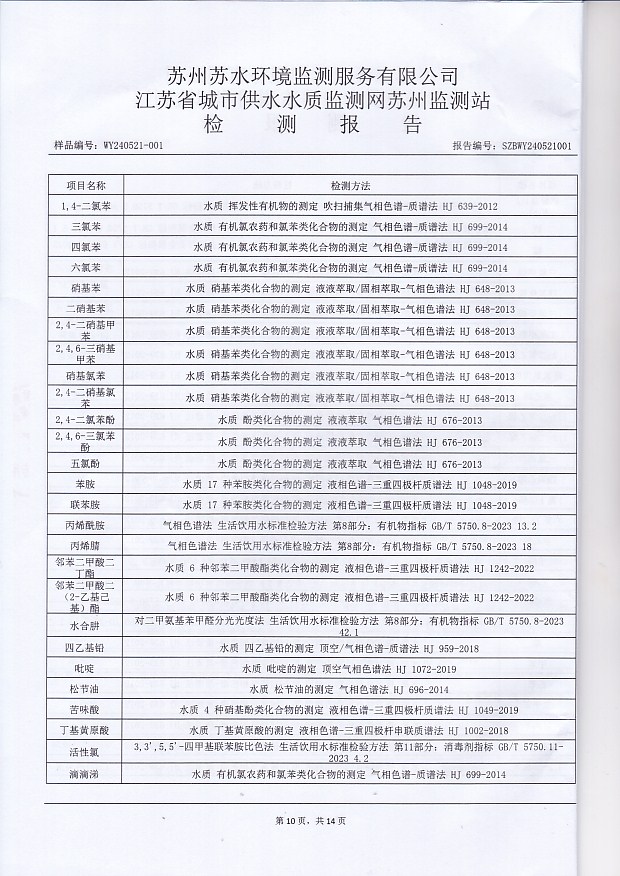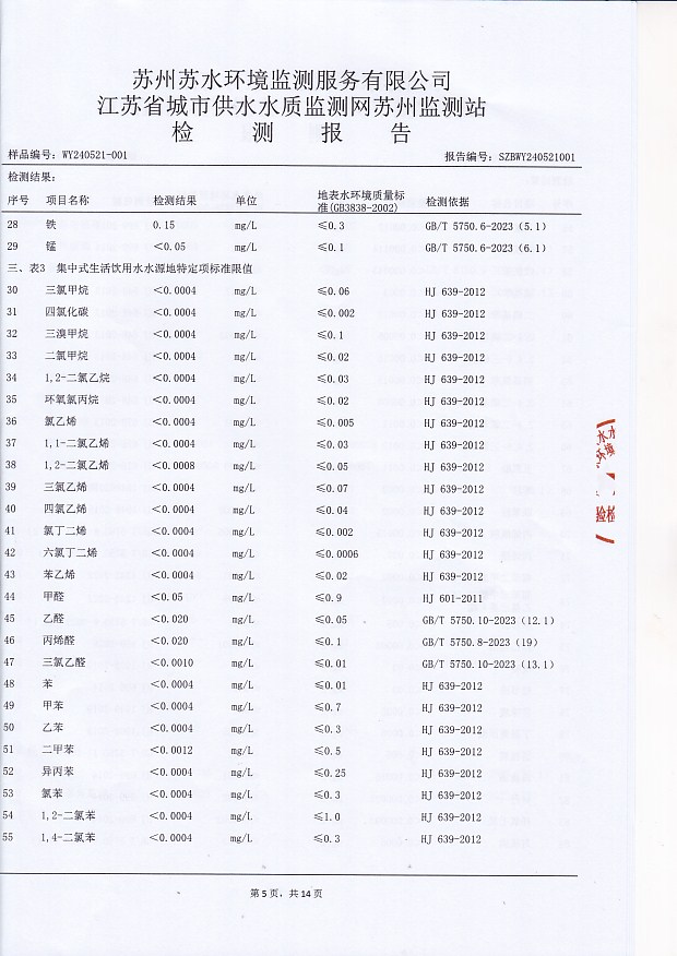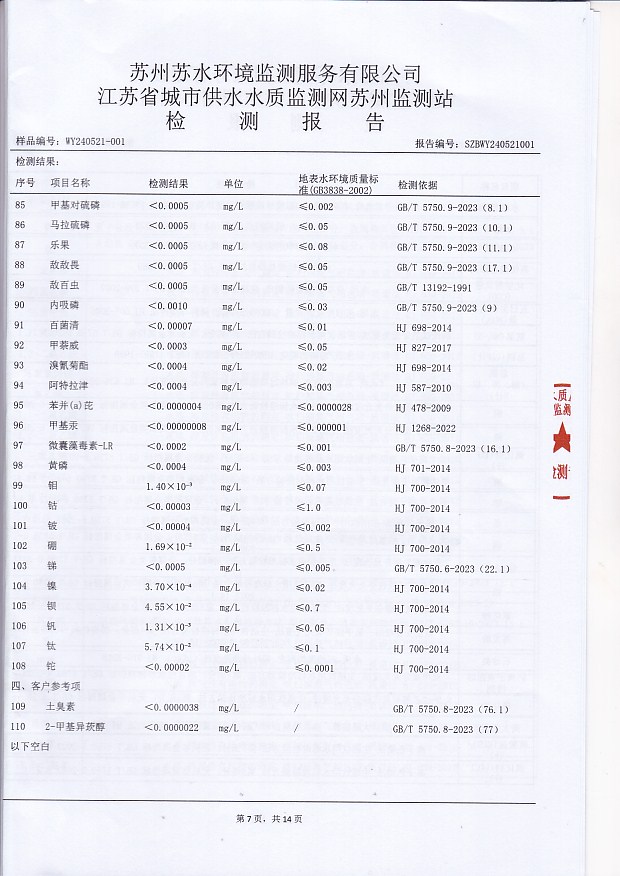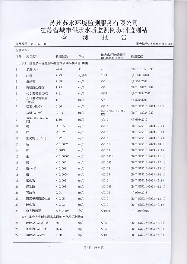2024年下半年水源水水質(zhì)報告