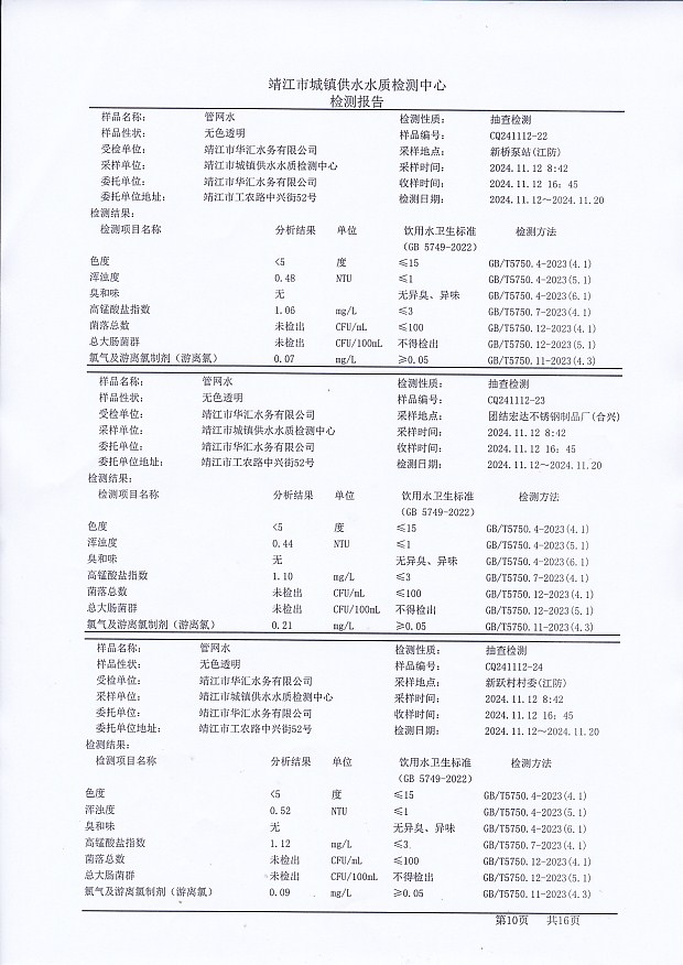 管網(wǎng)水檢測報告2024.10.22