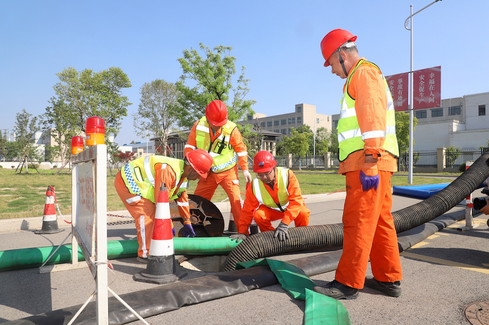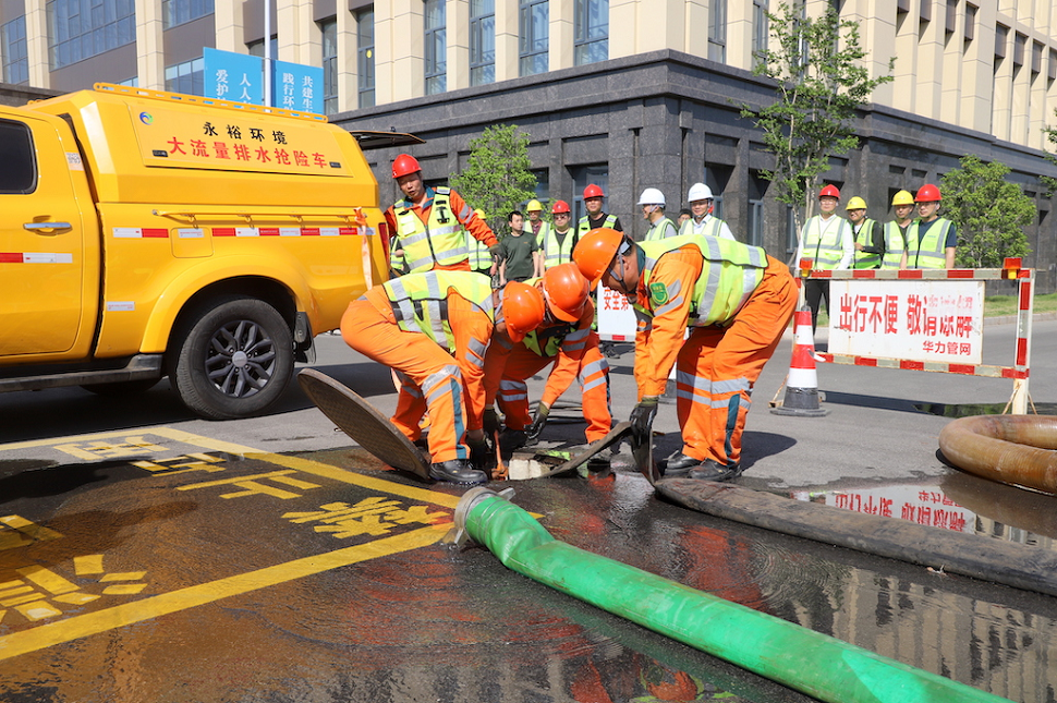 演練模擬短時強(qiáng)降雨導(dǎo)致城市主干道嚴(yán)重積水,地下管線排水能力不足,需緊急啟用移動排水泵強(qiáng)排場景,組織排澇人員迅速開展積水疏排,及時排除險情。