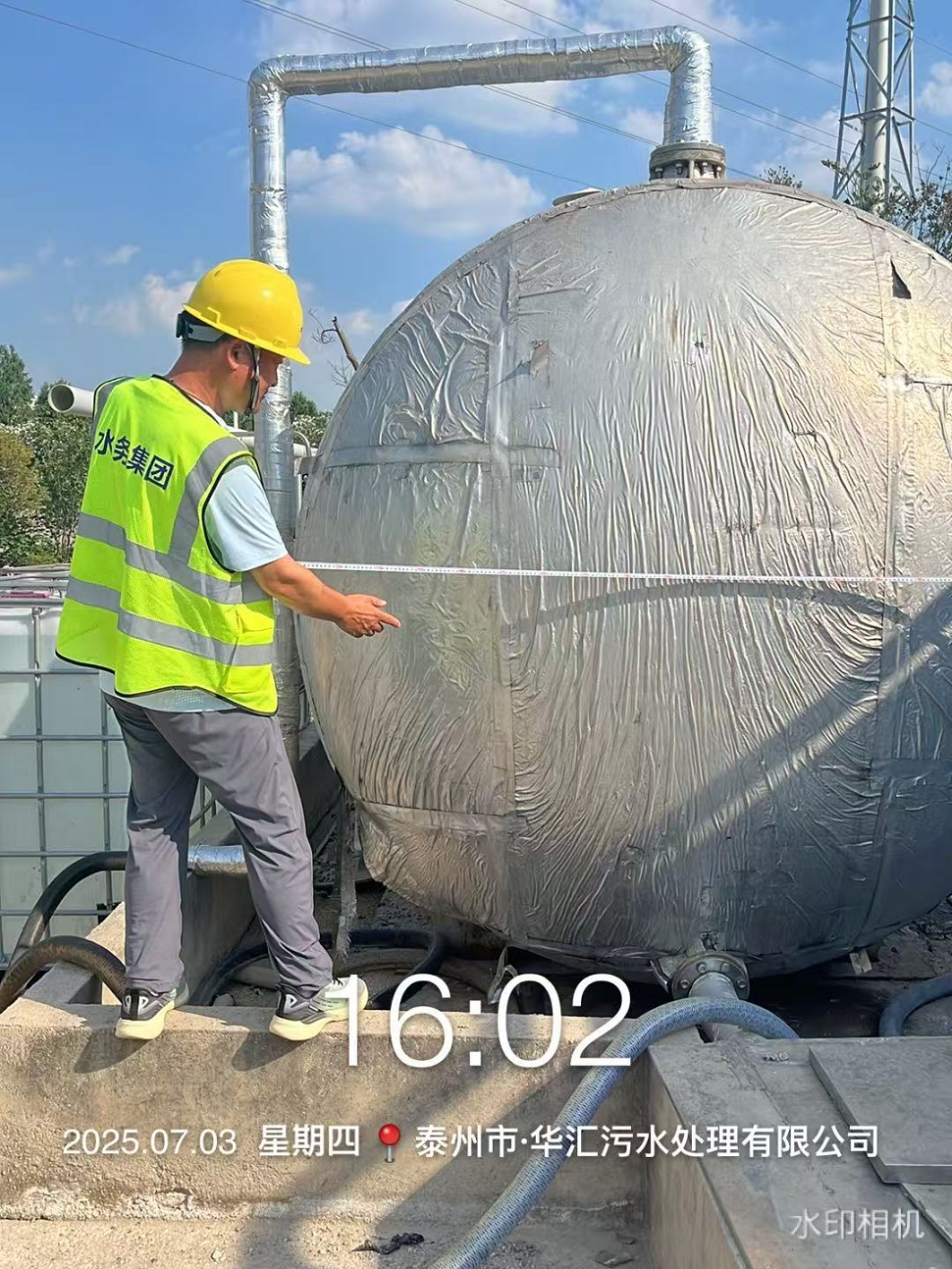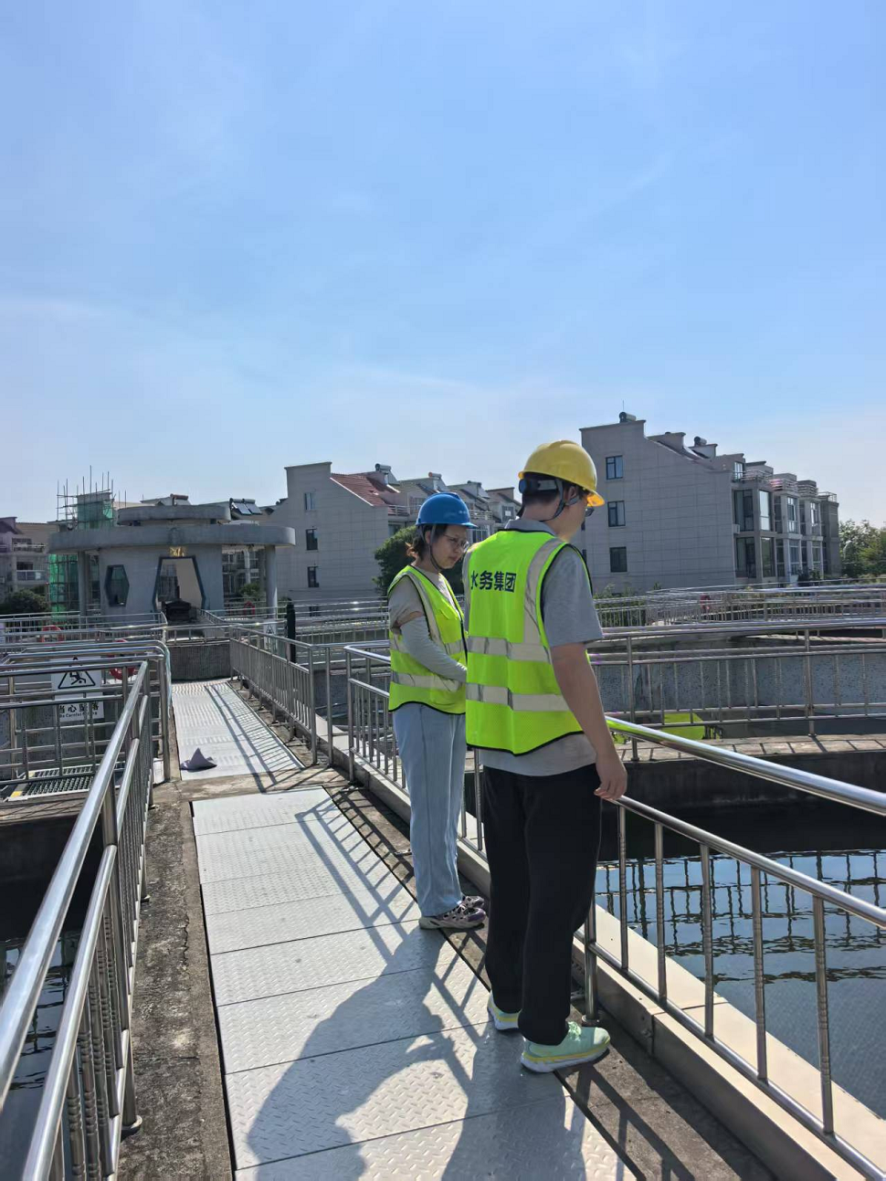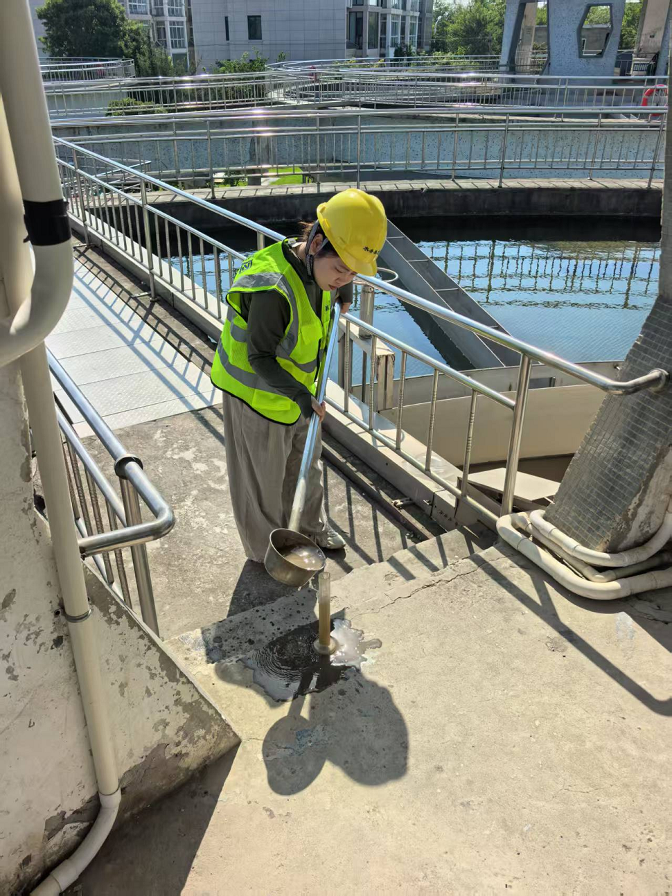 在污水處理池邊,他們頂著蒸騰的熱氣取樣檢測,豆大的汗珠順著安全帽帶不斷滴落;