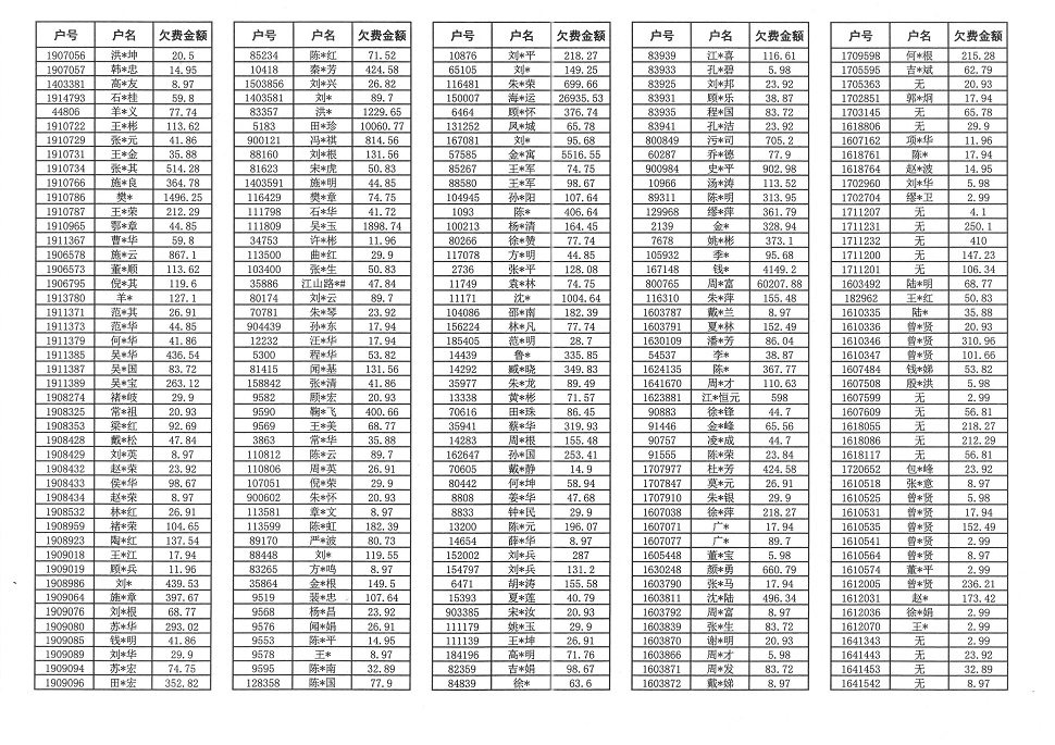 希下列單位(個(gè)人)自本水費(fèi)催繳通知書公告之日起十五日內(nèi)結(jié)清欠繳的水費(fèi)及違約金;如對(duì)欠費(fèi)金額有異議的,亦在十五日內(nèi)書面向我公司提出或至屬地供水服務(wù)中心反饋。如逾期,本公司將中止供水并依法追收,因此產(chǎn)生的一切法律后果和損失由欠繳單位(個(gè)人)自行承擔(dān)。