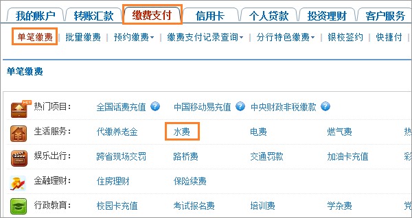 1、登錄建行個(gè)人網(wǎng)上銀行,依次點(diǎn)擊頁(yè)面上的“繳費(fèi)支付”--“單筆繳費(fèi)”--“水費(fèi)”。(如下圖)