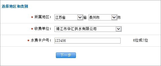 2、當(dāng)出現(xiàn)“選擇地區(qū)和類(lèi)別”時(shí),所屬地區(qū)選“江蘇。┲菔小,收費(fèi)單位選“靖江市華匯供水有限公司”,水費(fèi)卡戶(hù)號(hào)一欄填寫(xiě)您的水卡號(hào)碼,然后點(diǎn)擊“下一步”(如下圖)