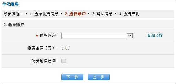 3、在選擇賬戶(hù)頁(yè)面,首先選擇“付款賬戶(hù)”,然后確認(rèn)繳費(fèi)金額(可先通過(guò)微信公眾平臺(tái)查詢(xún)),最后點(diǎn)擊“下一步”按照提示操作即可完成繳費(fèi)。