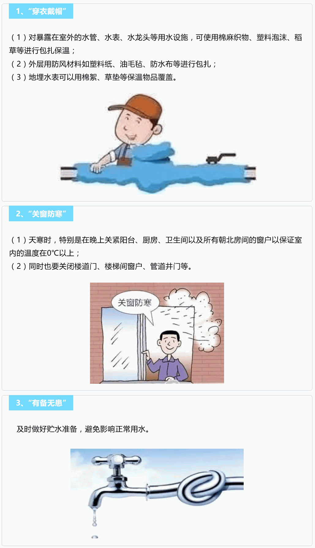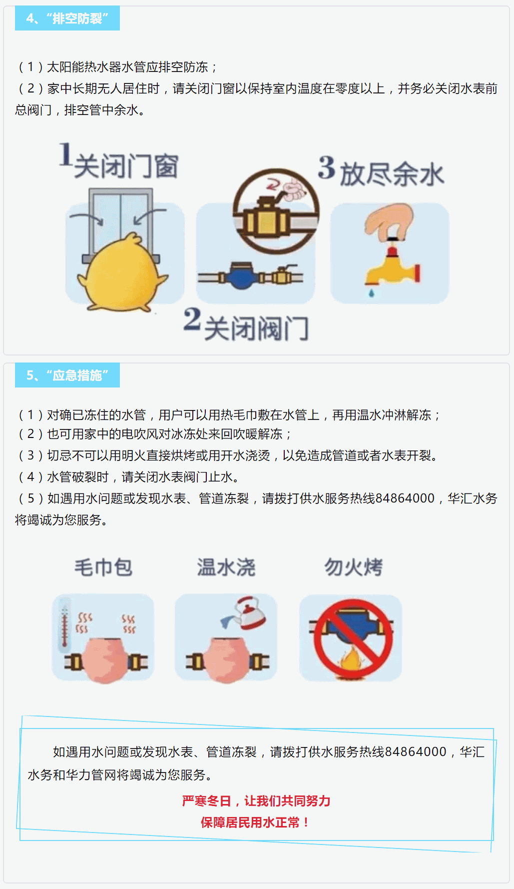 據(jù)最新氣象資料分析,我市13日夜里和15日有降水,受強(qiáng)冷空氣影響,15日夜里將出現(xiàn)雨轉(zhuǎn)雨夾雪天氣,部分地區(qū)可能有積雪;15—16日氣溫明顯下降,同時伴有6—8級偏北大風(fēng),17日早晨最低氣溫-3℃左右,大部分地區(qū)有冰凍。華匯水務(wù)溫馨提醒:請您做好用水設(shè)施的防凍保溫工作!以防低溫冰凍引起的無水、漏水現(xiàn)象發(fā)生,確保用水安全。